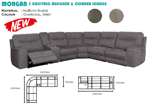 Stylish Modern Nubuck Suede Including 3 inbuilt Electric Recliners. Double stitched finish.